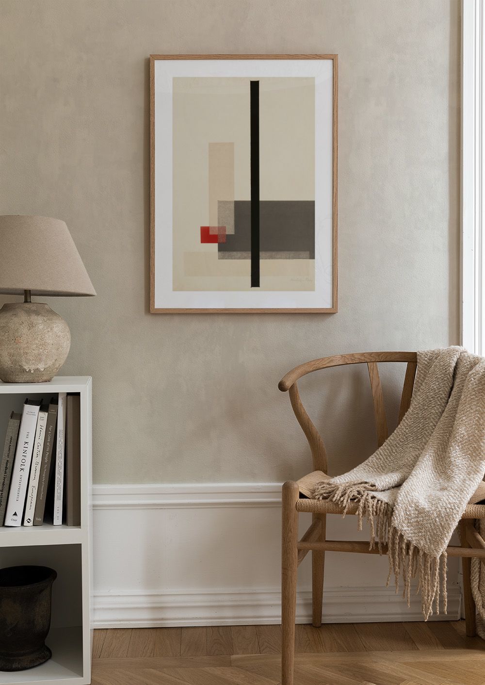 A geometric print featuring rectangles in grey, beige, and red, with a bold black vertical line on an off-white background.