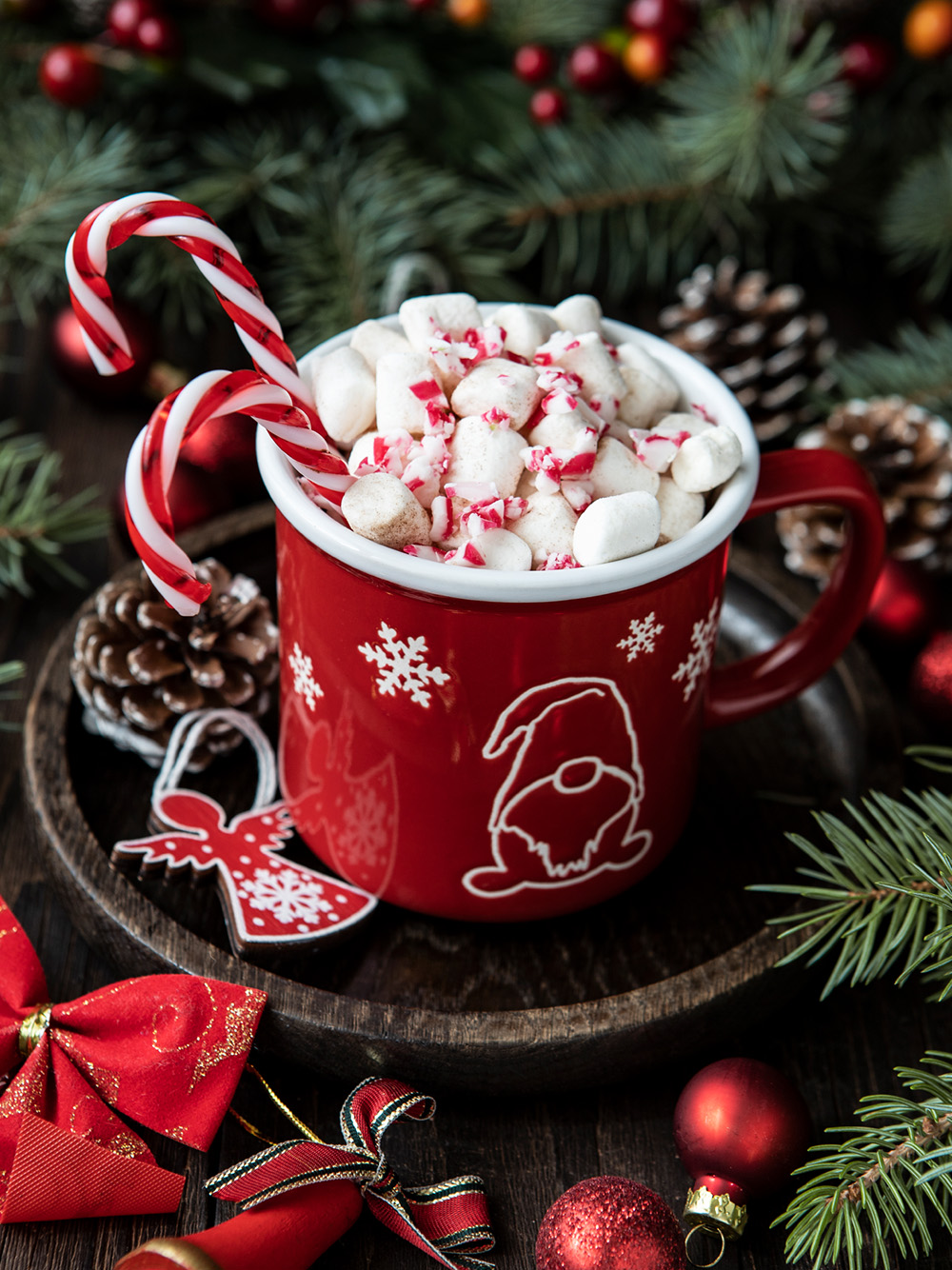 A festive red mug with white snowflakes and gnome design filled with marshmallows and candy canes. Christmas poster with pine branches, pinecones, and red baubles.